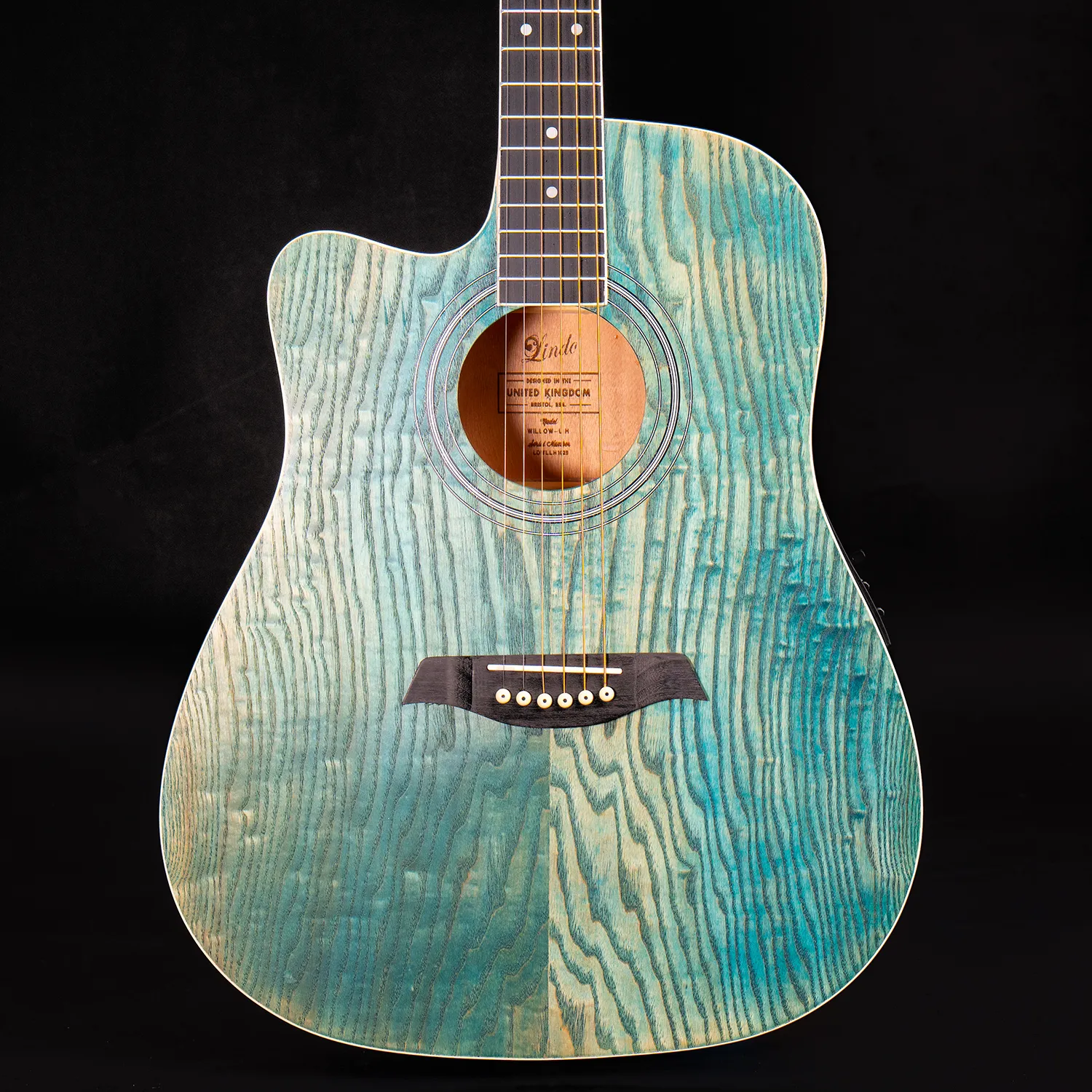 Introducing the Lindo Willow – an exceptional guitar designed by Lindo Guitars in Bristol. Whether you’re a beginner or an experienced player, the C-shaped neck ensures easy playability. This guitar is ideal for both big chord players and intricate fingerstyle, providing versatility like no other. The willow wood top, back, and sides, which have a unique and stunning open-pore transparent blue finish, highlight the individual grain patterns. The finish evokes the essence of faraway lakes, oceans, and warm summer days. The wood’s open-pore texture is pleasing to the touch and enables a more natural and open tone. The Lindo Willow is part of a range of Lindo guitars that utilize exotic woods, and it is sure to be a treasured addition to any collection.